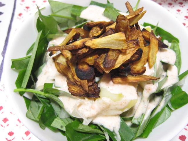4)2の器に3のソースをたっぷりかけ、仕上げに揚げ焼きしたゴボウをトッピングすれば出来上がり。