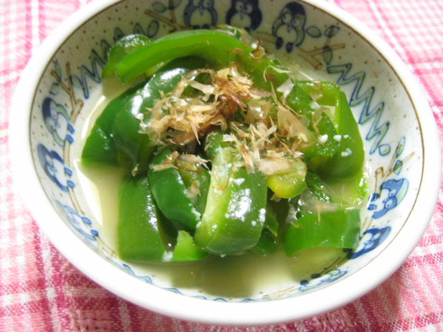 炒め物よりも量を食べられるし(小鉢1つ分でピーマン約2個)、加熱した後で余分な水分を絞るので、ピーマンの青臭さもかなり緩和します(私はピーマンのそういう部分も風味として楽しめる方なので、軽く絞るに留めてますが)。