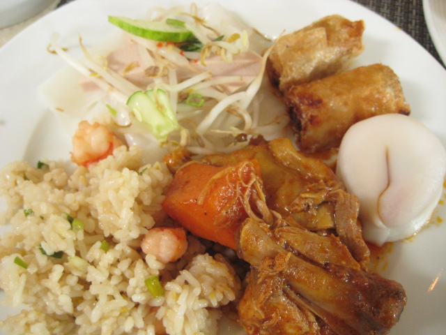 その所為か、流石に食事のバリエーションが物凄く豊富。この日はベトナム料理を主体に頂きました。手前からベトナム風エビチャーハン、鶏肉の煮込み、エビ蒸し餃子(これだけ違うかw)、チャーゾー(揚げ春巻)、バインクオンの皮だけに具をトッピングする料理(名前読むの忘れてましたw)&その他(パン、果物など)。