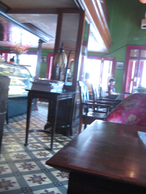 これが、その「チャオカフェ」です。2店舗あるそうなんですが、このグエンフエ通りにある方が二階建てで席数が多いんだとか。1階はこんな風に綺麗な装飾タイルが床に敷かれています。席は場所によってはソファー席もありますが、大体木製の椅子ですね(上がってませんが、二階席は全てソファー席だそうです)。ここを紹介されていた現地在住の方のブログに、1階席の方が明るくて雰囲気がいいとのことだったので、空いている事をこれ幸いと1階に陣取ったのですが、後程分かったことが…1階は喫煙席なんですよwたまたま空いているのと、天井が高いのでそれほど気にはならなかったんですが、混みあってるとタバコの煙は気になりそうですね。
