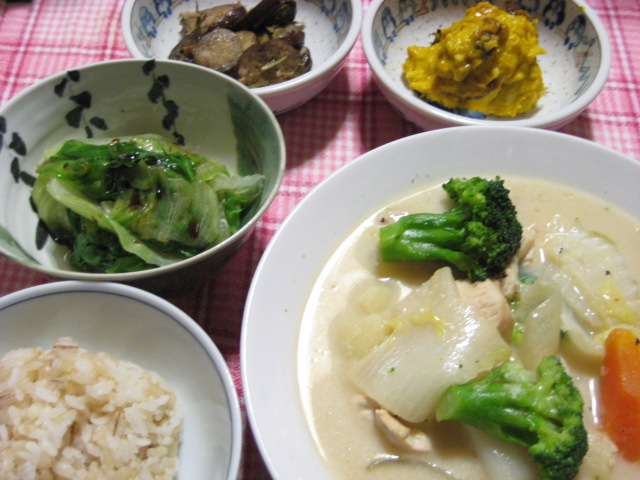 で、昨日の夕飯。メインのクリームシチューは実家でもらったので、家では作りおきのカボチャサラダ、茄子のビネガーソテーに、レタスの湯引きをプラスで。