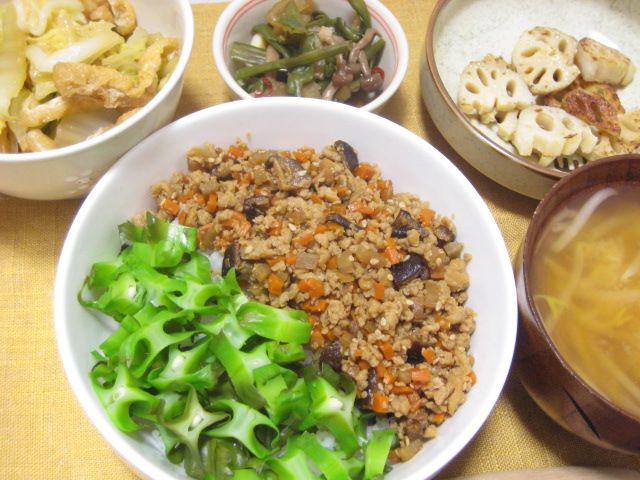 メインのそぼろ丼は氷豆腐の他干しシイタケやニンジンなどを入れて甘辛く炒め煮してます。元々は常備菜用に、ふりかけ感覚でご飯にかけて食べるのを意識して作ったんですが、こういうのもまたアリですね。緑の野菜はベランダで育てているシカクマメ。今年初めて栽培したんですが、聞いていた少々の苦味も全くないし、味はサンドマメに近いかな。