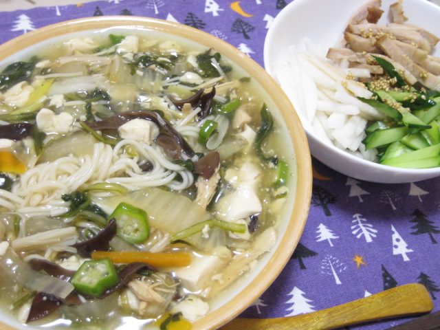 この日も家にあるもので何か作ろうということで、夏場に余らせてしまった素麺を使って、温かい麺類を。酸辣湯にしたのは、あんかけものが食べたかったのと、冷蔵庫のストック品を一番品数を取り込んだ上で、まとめられるメニューで思いついたのがこれだったから、ですねー。けど、美味しかったですよ。麺と一緒に食べるので、スープはやや味を濃いめ(または酢を強めに効かせて)にしてあります。豆腐も入ってるんで、そうしておかないと、時間が経つにつれて豆腐の水分で薄くなっちゃいますしね。