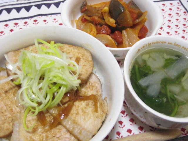 副菜はラタトゥイユ。これもズッキーニが出回る時期がいい加減終りかけてるんで、今年は最後かな。スープは野菜のピリ辛スープで。