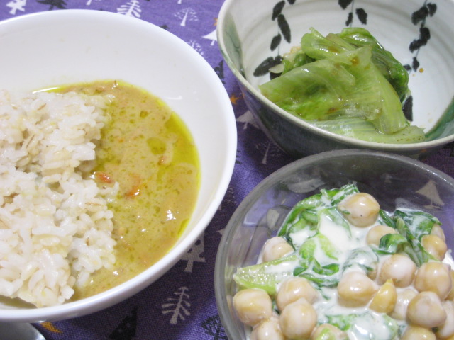 この日からしばらく、仕事で帰宅するのがちょっと遅くなる日が続きそうなので、夕飯はどうしても品数少なめ、更には手抜きメニューが続く予感…せめて栄養バランスだけでも崩さないようしたいところなんですが…この日は缶詰のチキン入りグリーンカレーに、レタスの湯引き、レタスとヒヨコ豆のヨーグルトサラダで。