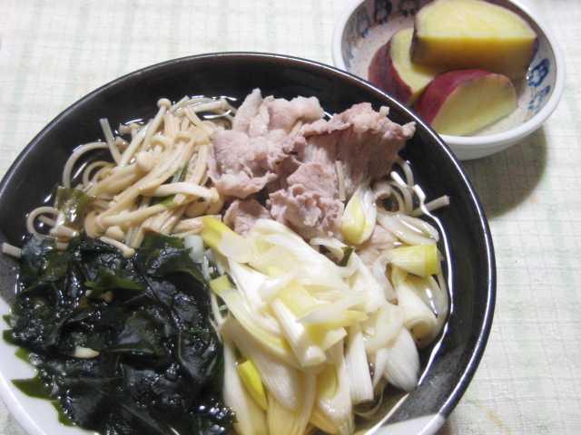 この日は麺が食べたいってことで、買い置きの乾麺で蕎麦に。具は家にあるものだけってことで、こんな感じ。