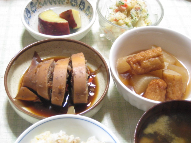 イカめしはこの間もらったものの残り。大根と天ぷらの煮物は冷凍ストック品の大根を使って。これ、火をある程度入れたものを冷凍しているので、煮物を作る際に通常よりも短時間で出来るし、何よりも一旦凍らせることで味を含みやすくなるので、かなり重宝です。生の大根を長い間放置して、すができてしまったり、腐らせてしまうなどで無駄にせずに済むので、一石三鳥くらいのメリットはあるかと思いますよ。