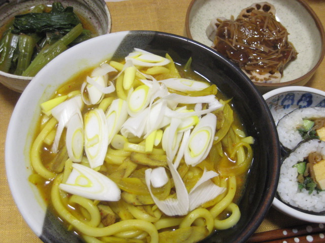 昨日の夕飯。カレーうどんは和風の肉が入ってないバージョン(油揚げが入ってる)です。ちょっと汁が少なかったのがご愛嬌(苦笑)