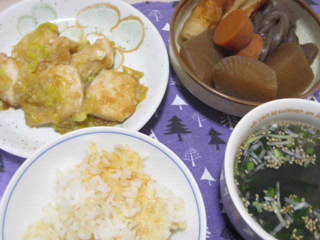 副菜の煮物は一応前日に仕込んでいたやつです。特にこんにゃくは一日置いた方が味が染みておいしいですしねー。当日は練り物を最後に加えたくらいです。これに汁ものとして、市販のしじみスープを。ご飯は新しい炊飯器がおこげが作れるので、この日もおこげ入りのを炊きました。好きなんですよねー、おこげ。
