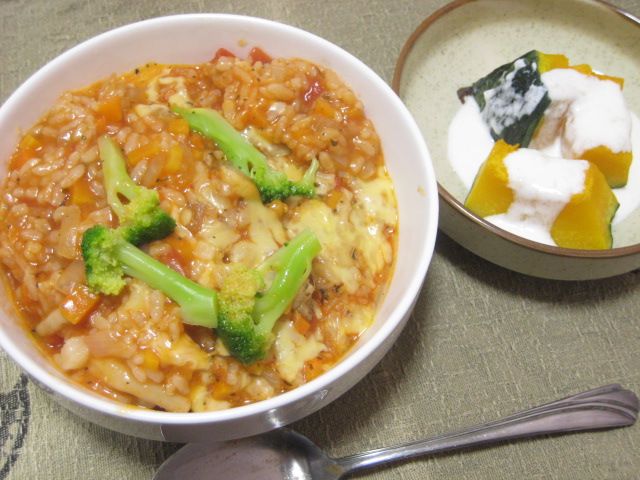 ご飯は冷やご飯があったので、だったらリゾットか雑炊だなってことで、野菜がより多く摂れるリゾットで。副菜は蒸しカボチャ。