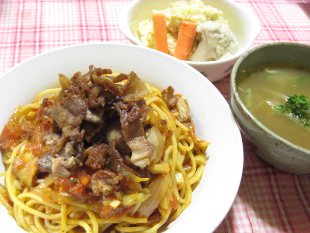 この日の夕飯。元々はお好み焼きにするつもりで、冷凍してた豚肉を解凍したんですが、冷蔵庫を見たら、数日前に開けたトマトの缶詰を発見してしまいまして、急遽変更することに。いろいろ首を捻った挙句、こんな風になりました。勿論、こーゆーパスタは初めてですが、思ったより、イケましたw