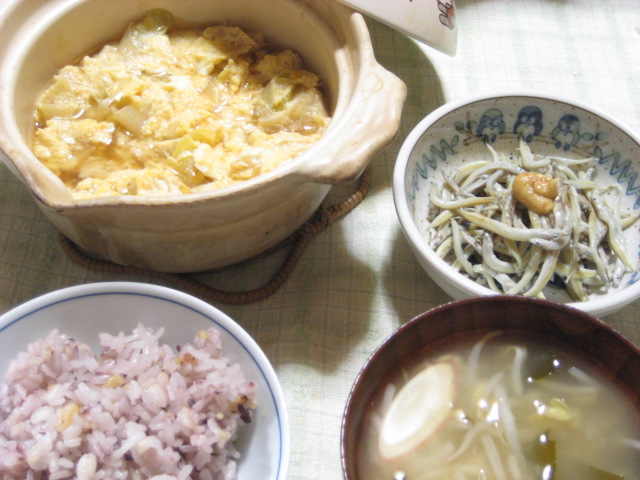 凍り豆腐と長ネギの卵とじ、新子、もやしの味噌汁に雑穀ご飯。