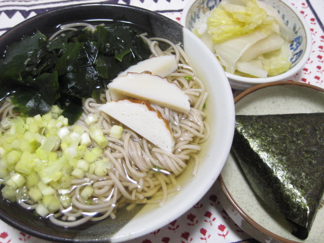 この日は戻ったのがちょっと遅くなってしまったので、すぐに用意できるもので。幸いネギは刻んであったし、そばは乾麺が残っていたので、それを利用。つゆもうどんやそばに使える粉末のをストックしてあったので(これがあると意外に便利です。丼物とかにも転用できるし)。おにぎりはスーパーで購入。具は高菜めんたいだったかな。これだけだと野菜が少ないので、小鉢を兼ねて水キムチを。これは赤いキムチと違って、辛さはないので(酸味はあるけど)、こうした和食とも比較的合わせやすいです。