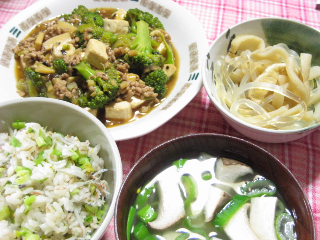 昨日の夕飯(3/9):豆腐とブロッコリーと豚挽き肉の豆鼓炒め煮他。