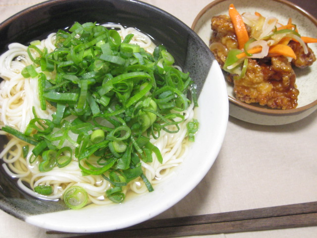 昨日は映画を観に出かけて、戻ってからの夕飯だったことと、結構暑かったので、今年最初の冷たい麺にしました。器を分けるのが面倒だったので、汁に水で締めた麺、たっぷりの大根おろしと刻みネギで。おかずの鶏唐揚げの甘酢あんかけは出来合いのもので。