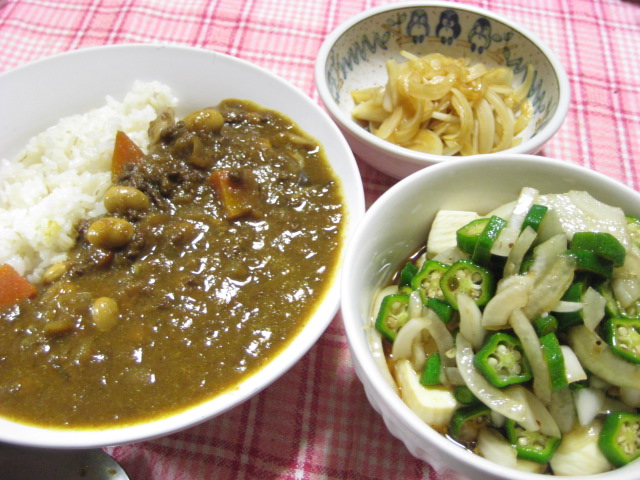 副菜は新玉ねぎとオクラの豆腐サラダ、新玉ねぎの甘酢漬け。新玉ねぎの季節なので、ここぞとばかりに甘酢漬けを仕込んでます。これ作っておくと、なにかと重宝なんですよねー。そのまま食べてもいいし、刻んでマヨネーズなどと混ぜれば、タルタルソース的なものもすぐ出来ちゃいますし。