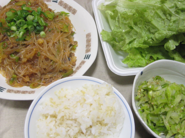 夕飯は久々のマーボー春雨。野菜が足りないので、レタスに包んで食べました。副菜は塩だれキャベツで。