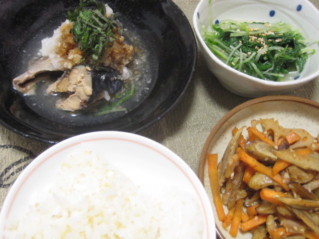 この日はシンプルに。鯖のおろしがけ、水菜の辛子びたし、ゴボウとレンコンのキンピラで。
