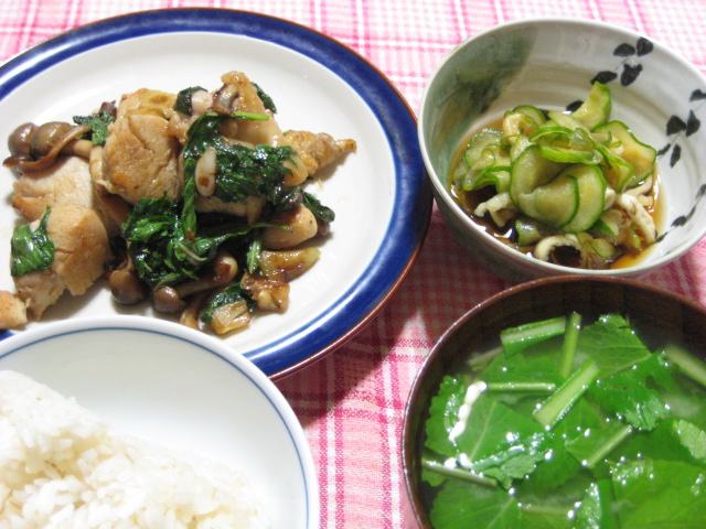 副菜はキュウリと切り干し大根の酢の物、汁は小松菜とわかめの味噌汁。