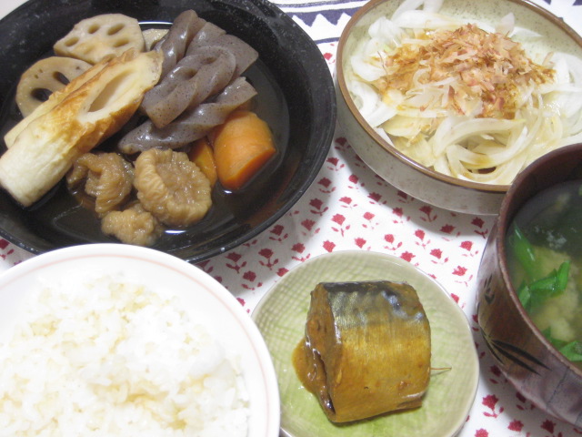 副菜は新玉ねぎのおかかポン酢がけと鯖の味噌煮(缶詰)。
