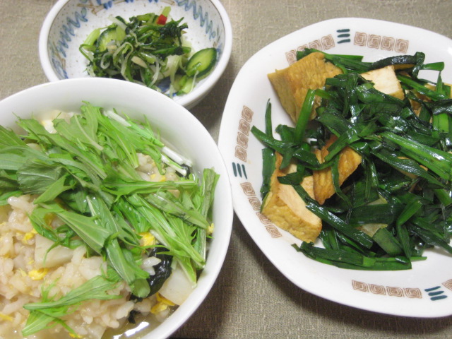 中途半端にご飯が残っていたので、それを使って雑炊と(具は卵と蕪と水菜とネギ)、厚揚げとニラで炒めものを。野菜の嵩増しにズッキーニも加えてニンニク醤油で簡単に味付け。それと小鉢で浅漬けを。