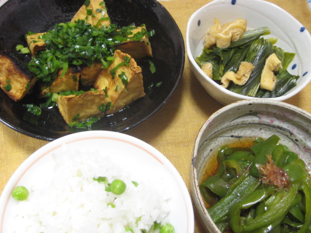 ちなみに厚揚げのニョクマム漬け、小松菜と油揚げの煮物、ピーマンのおひたしでした。