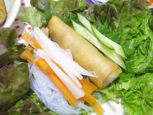 この日は揚げ春巻でしたが、ベトナム風に大きな葉野菜に麺や野菜、香草を一緒に巻いて食べられるよう、細くて小さめのものに仕立てました(現地のレストランで揚げ春巻を頼むと、こんな感じで葉っぱ類がついてくるんです)。こうすると結構ボリュームも出せるので、手巻きずしのように、これだけで食事として完結させるのも可能になるんですよね。