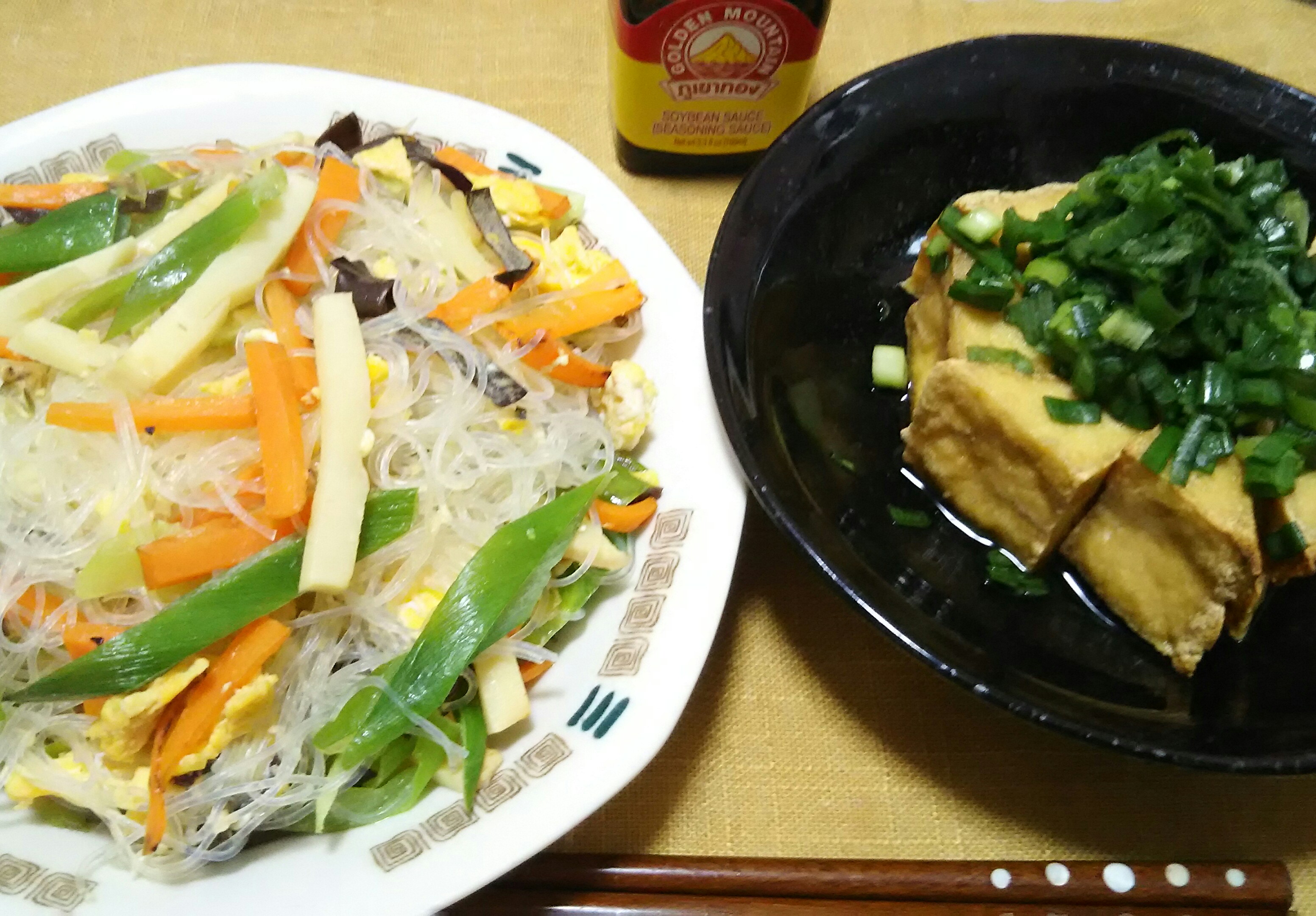 この日の夕飯はベトナム料理二品。ミエン・サオ(焼き春雨)と揚げ豆腐のニョクマム漬けで。