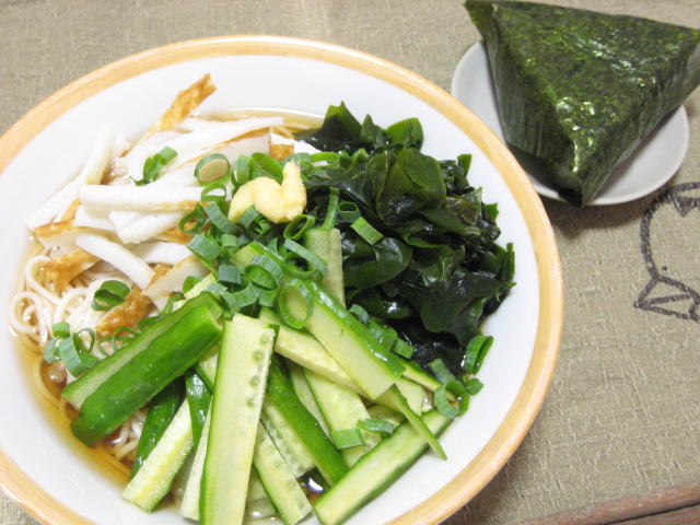 素麺は洗物を減らしたかったので、ぶっかけスタイルに。具は切ったり戻したりするだけで用意できるものにしたので、キュウリ、ちくわ、わかめ。これに刻みネギとおろしショウガで。