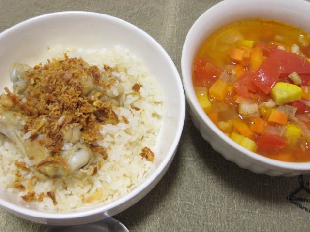 昨日の夕飯。冷凍庫を少し空けたかったので、ストックしていたシンガポール風チキンライスと、具だくさんの野菜スープで。このスープだけで野菜の量は200gを確実に超えてます(二人分で400gくらい入れたので)。ひとつ残念だったのは、ニンニクチップが作れなかったので、チキンライスが若干物足りない味だったことですかねぇ…(代わりにフライドオニオンを使ったものの、やっぱりニンニクチップは必要と分かっただけw)