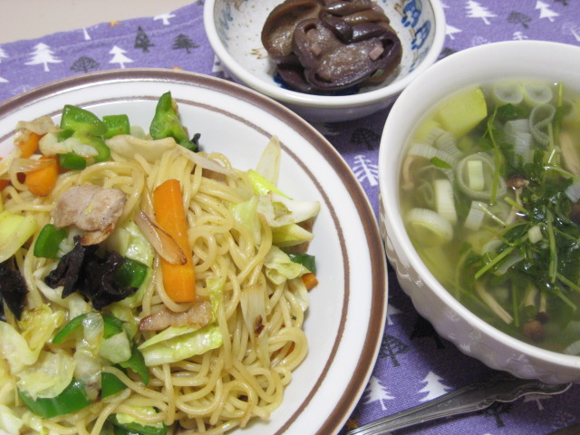 焼きそば用の麺を買ってあったことを思い出したので、昨日はこれを使って。添付されていた粉末調味料は塩焼きそばだったんですが、使いかけのオイスターソースをできれば使い切ってしまいたかったので、そっちをベースにした味付けにしました。具はほぼ野菜で。