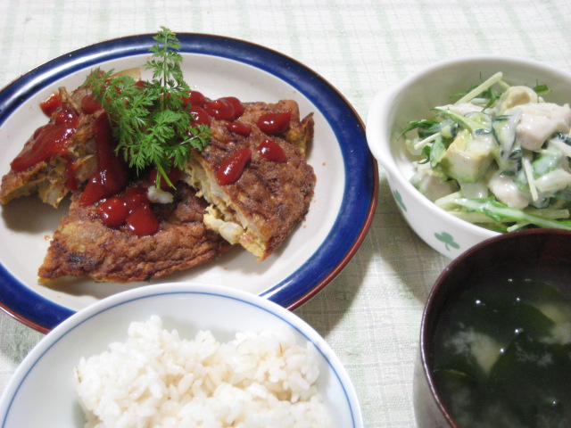副菜は鶏むね肉とアボカドのヨーグルトサラダ。むね肉は前日の鶏しゃぶ用にj粉をまぶして茹でたものを多めに作っておいたのを、転用してます。一度に余分作っておいた方が、光熱費的にも、時間的にも節約できるから、今後は常にこれで行こうかなと。