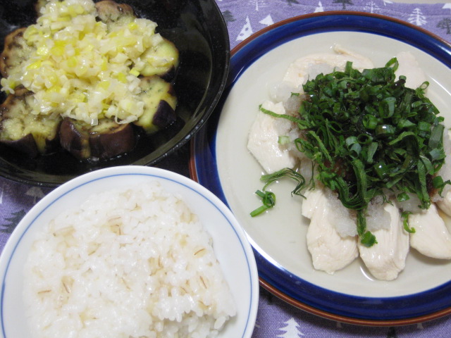 この日は鶏むね肉を冷しゃぶ風に。たっぷりの大根おろしでいただきました。もう一品は蒸し茄子のネギソースがけで。
