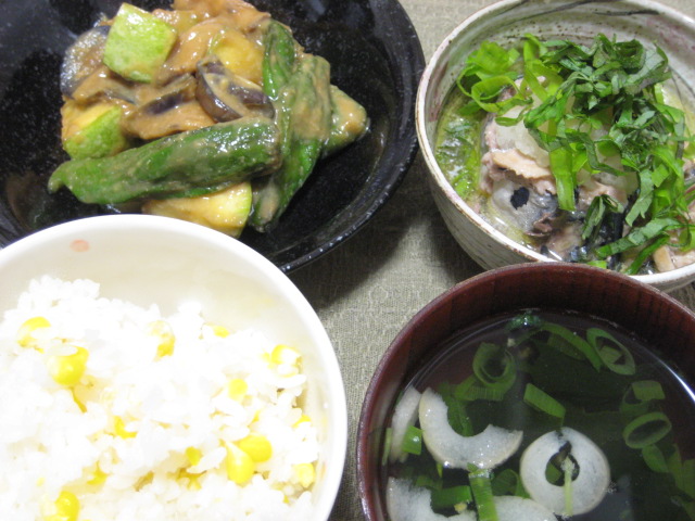 ご飯がトウモロコシのおこわにしたので、おかずは前述の味噌炒めに加えて、鯖水煮のおろしがけで。汁物はわかめの吸物で。