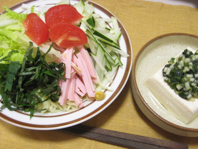今年初めての冷麺(冷やし中華)。具材は冷蔵庫にあるもの+ベランダの青シソだけを使いました。冷奴のトッピングはキュウリ、青シソ、モロヘイヤ(ベランダ栽培)を練り梅+醤油で。