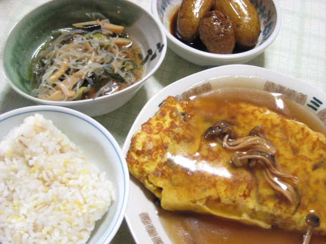 続けて月末モードな夕飯。卵焼きは普段は切り干し大根の他は刻みショウガくらいしか入らないんですが、この日は木耳と、タケノコ、長ネギも投入。あんはそれに合わせて甘酢風味にしました。あと、戻した干しシメジも加えて。