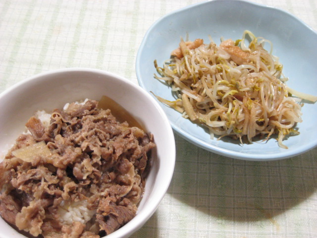 牛丼は残ってた冷凍食品のです。すき家のやつ。