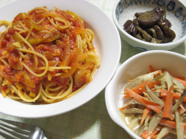 パスタだけだと野菜が少ないので、副菜は野菜尽くしで。ゴボウサラダ、ナスのビネガーソテー。そろそろ生バジルも終わりなので、ナスのソテーもあと一回くらい作ったら終わりですかねぇ…