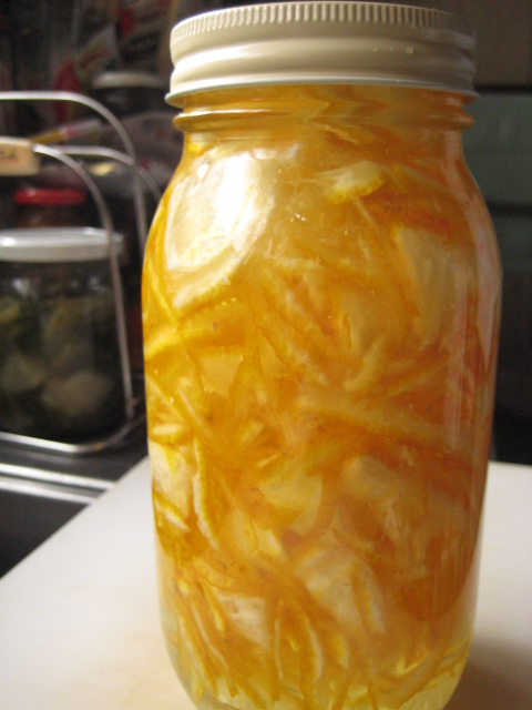 2)蓋つきのガラス瓶に氷砂糖と1の皮と実を交互に層になるよう入れ、蓋をする。そのまま数日置き、氷砂糖が完全に溶ければ出来上がり(最後は上の方がよく使っていないので、底の方から全体をよくかき混ぜると、綺麗に出来上がります)