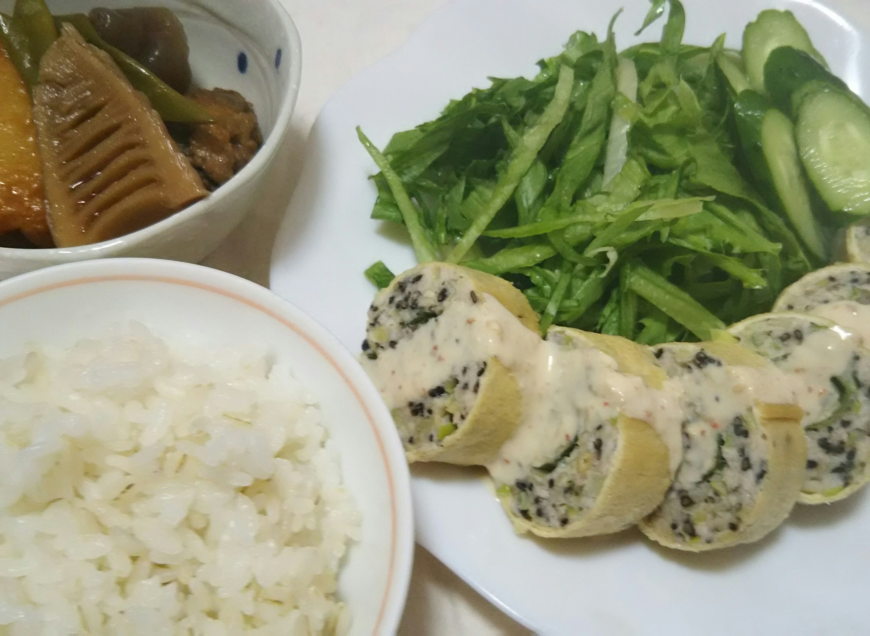 昨日の夕飯(6/12):鶏挽き肉と黒ごまの揚げ巻き蒸し他
