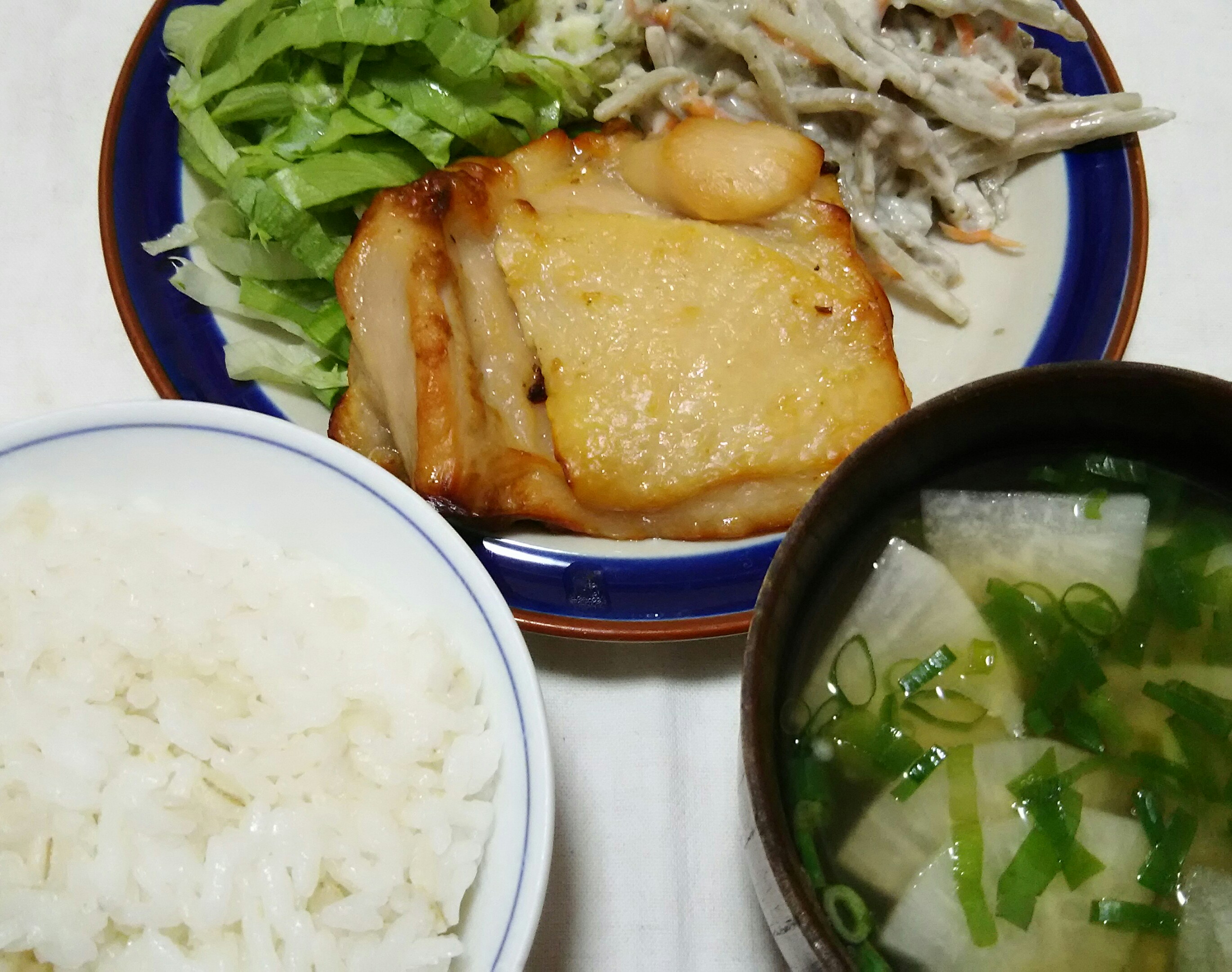 貰ったものと、冷蔵庫に置いてあったチルド品メインな夕飯。鶏モモ肉のソテー、ごぼうサラダ、大根の味噌汁。
