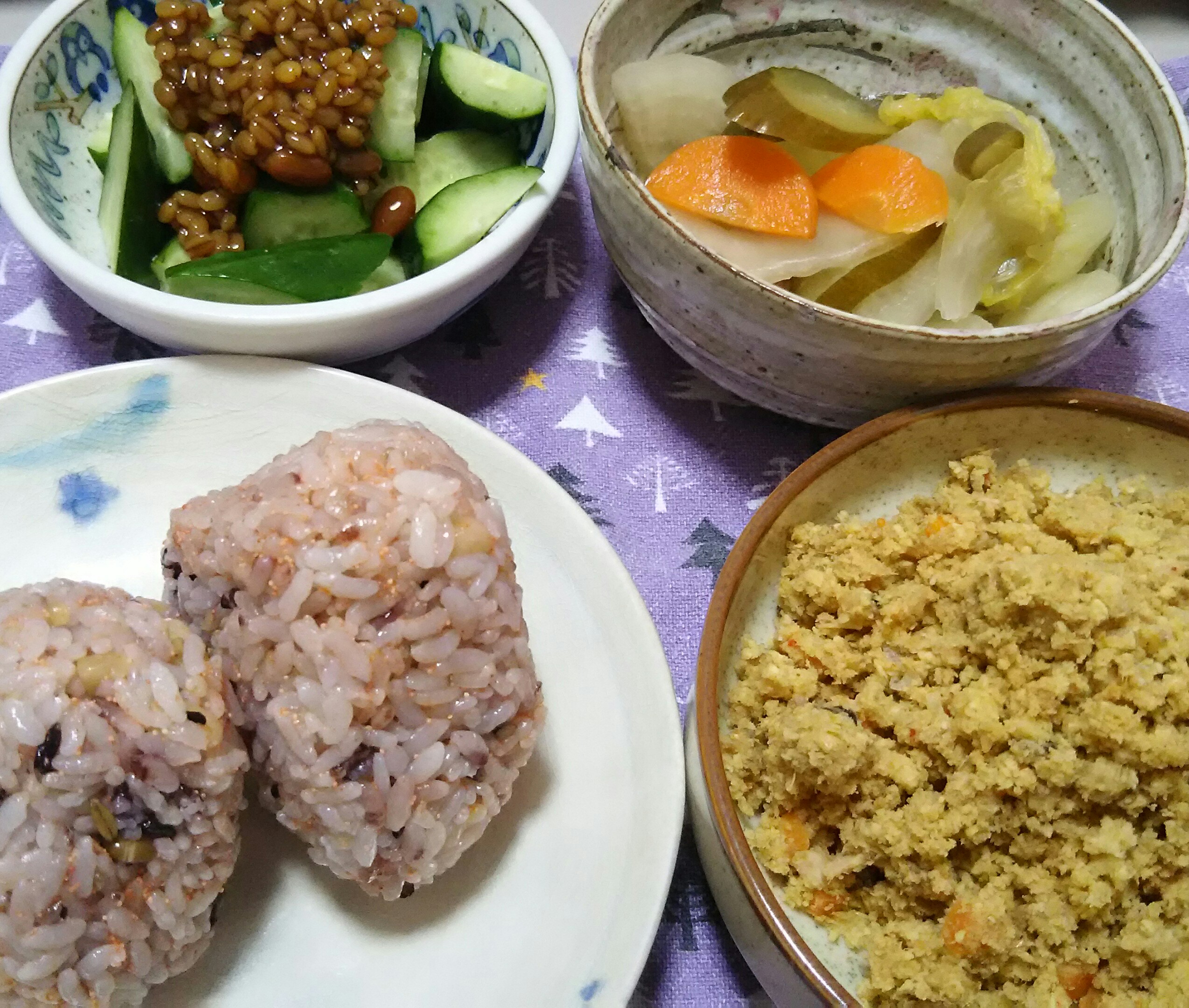 混ぜご飯のおにぎり、カレーおから、水キムチ、もろきゅう