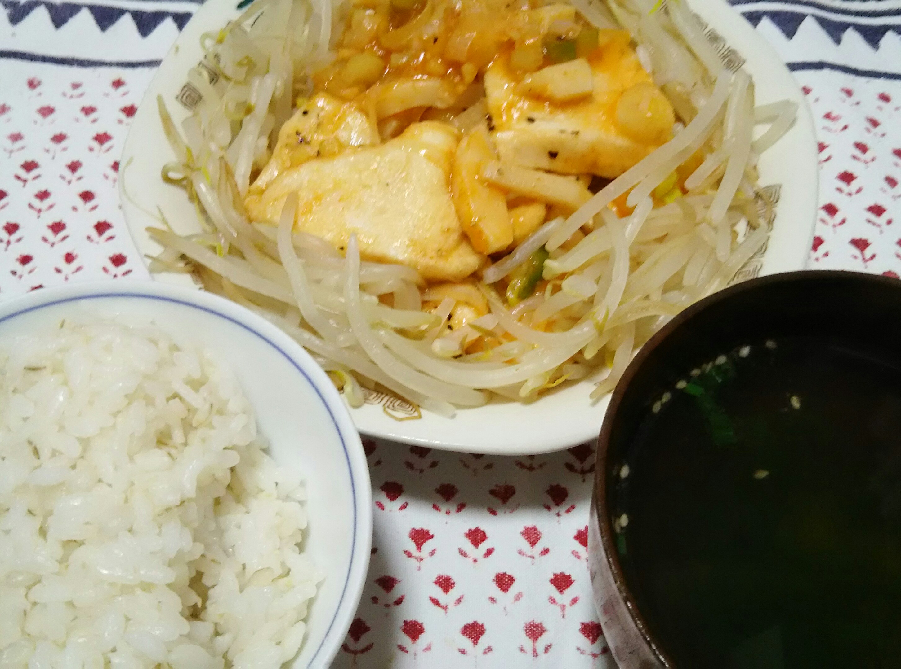 鶏むね肉のチリソース炒め(蒸しモヤシ添え)、わかめスープ。