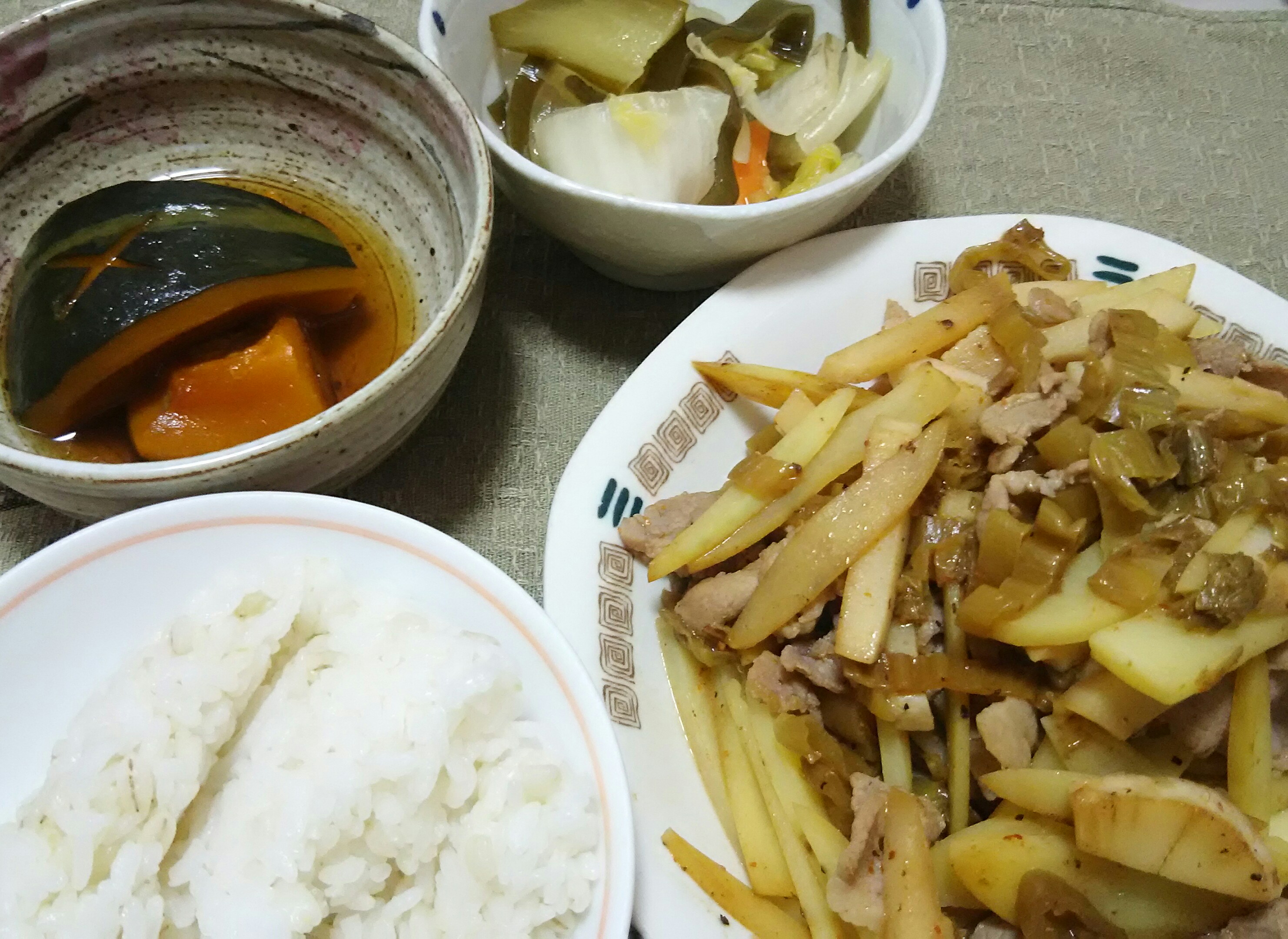 昨日の夕飯(6/1):たかなとジャガイモ、豚肉の炒め物他