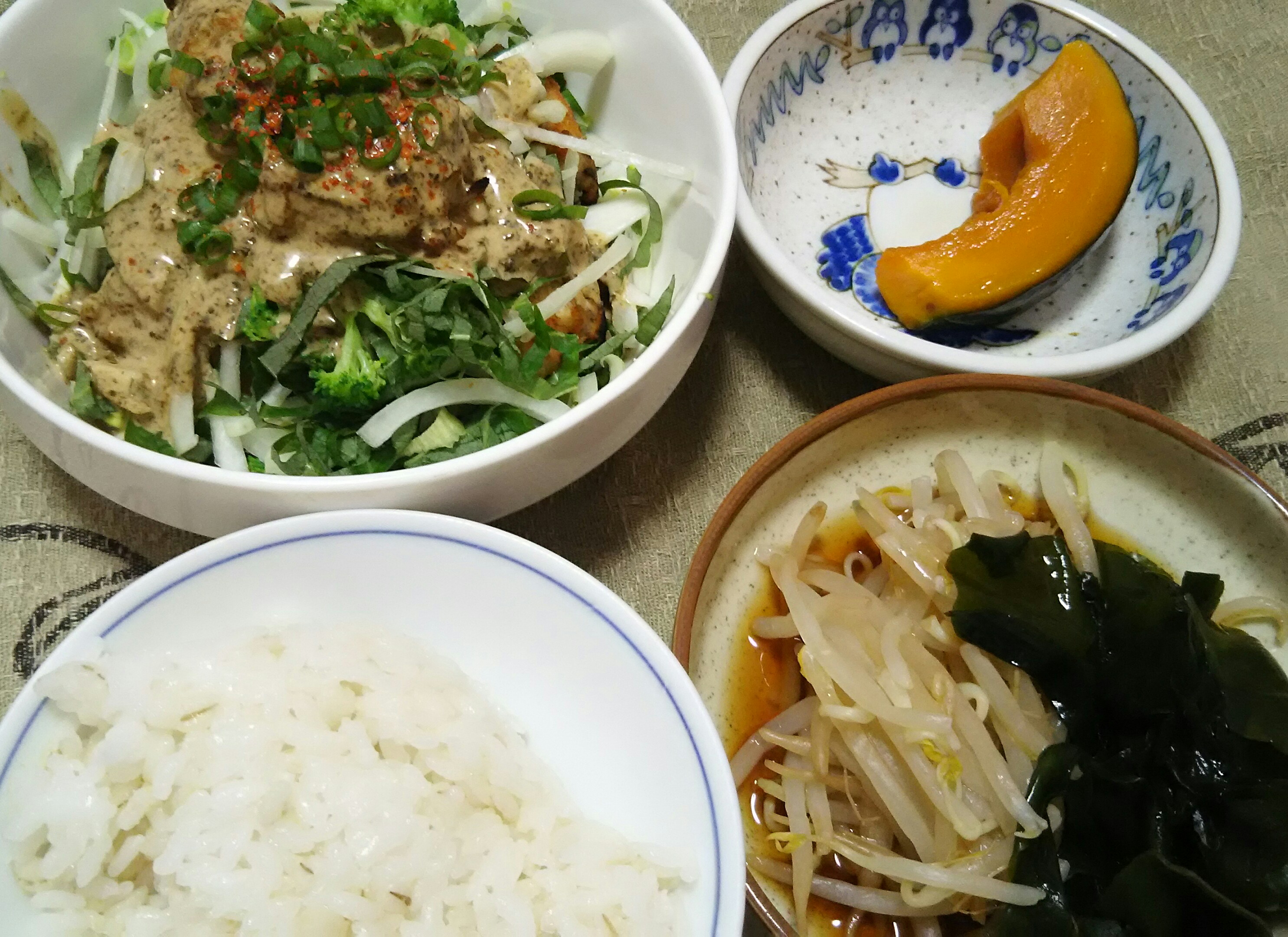 鶏ごぼう団子のおかずサラダ、カボチャの煮物、もやしとわかめの酢の物。