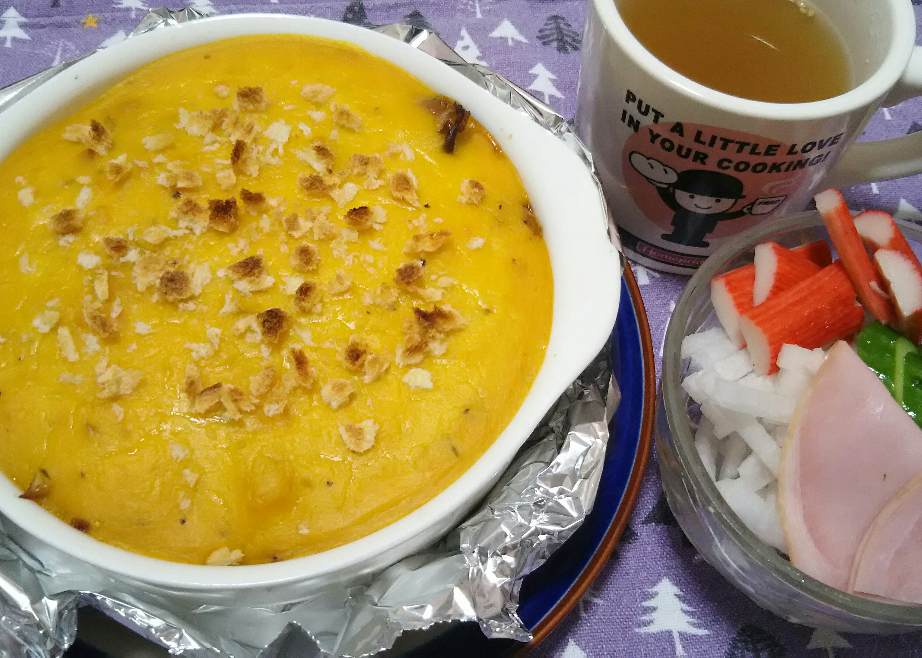 カボチャのドリア、野菜サラダ、生姜のスープ。