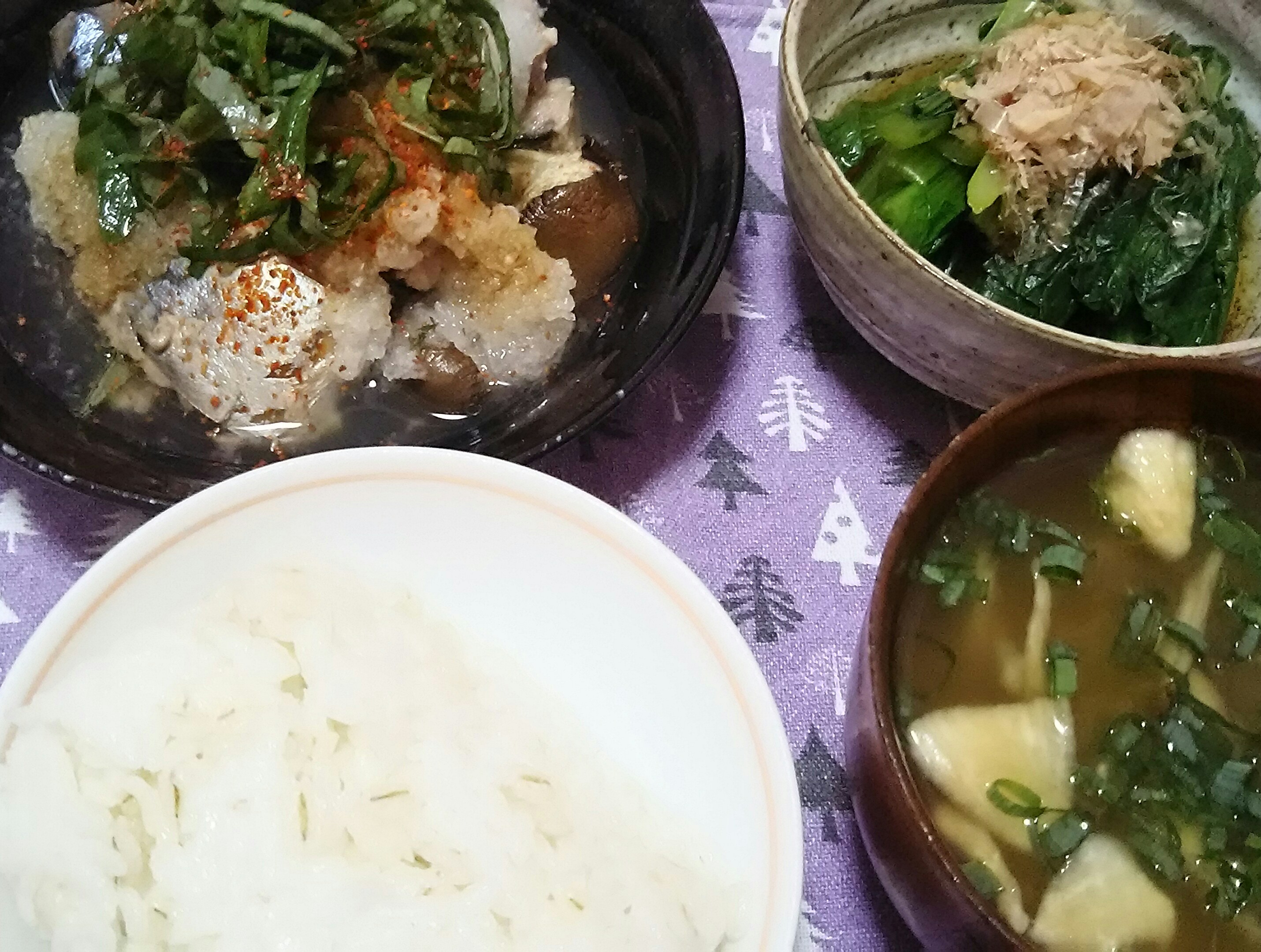 鯖の水煮のおろしポン酢がけ、小松菜のおひたし、干し大根のみそ汁。