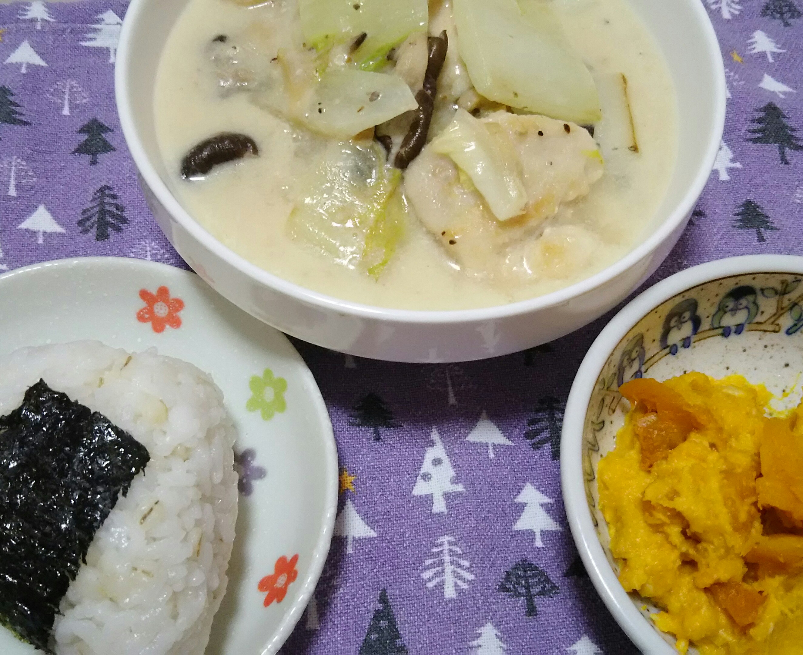 鶏むね肉のクリーム煮、カボチャのサラダ、おにぎり。
