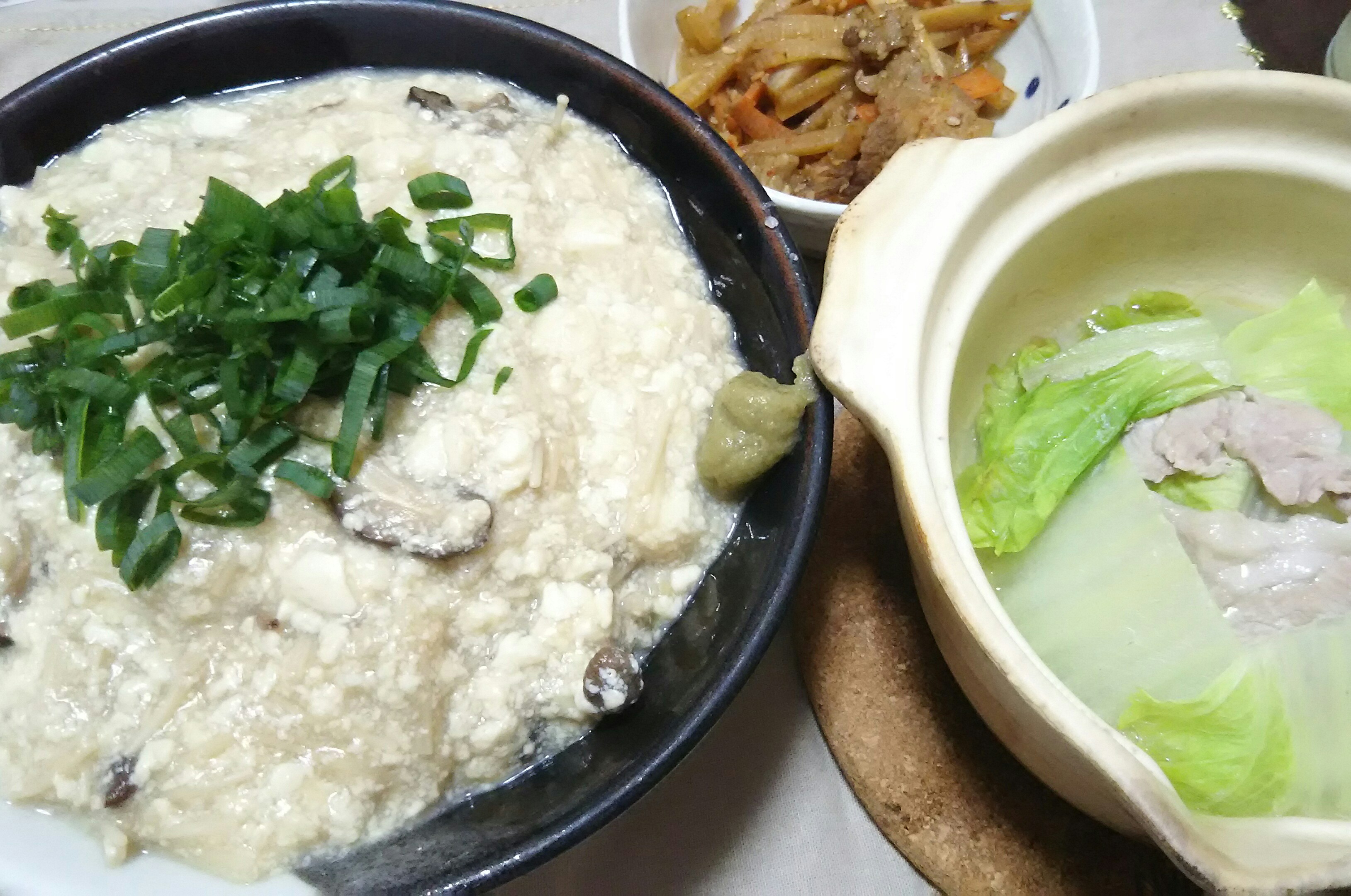 豆腐丼、白菜と豚肉の重ね蒸し、キンピラ。