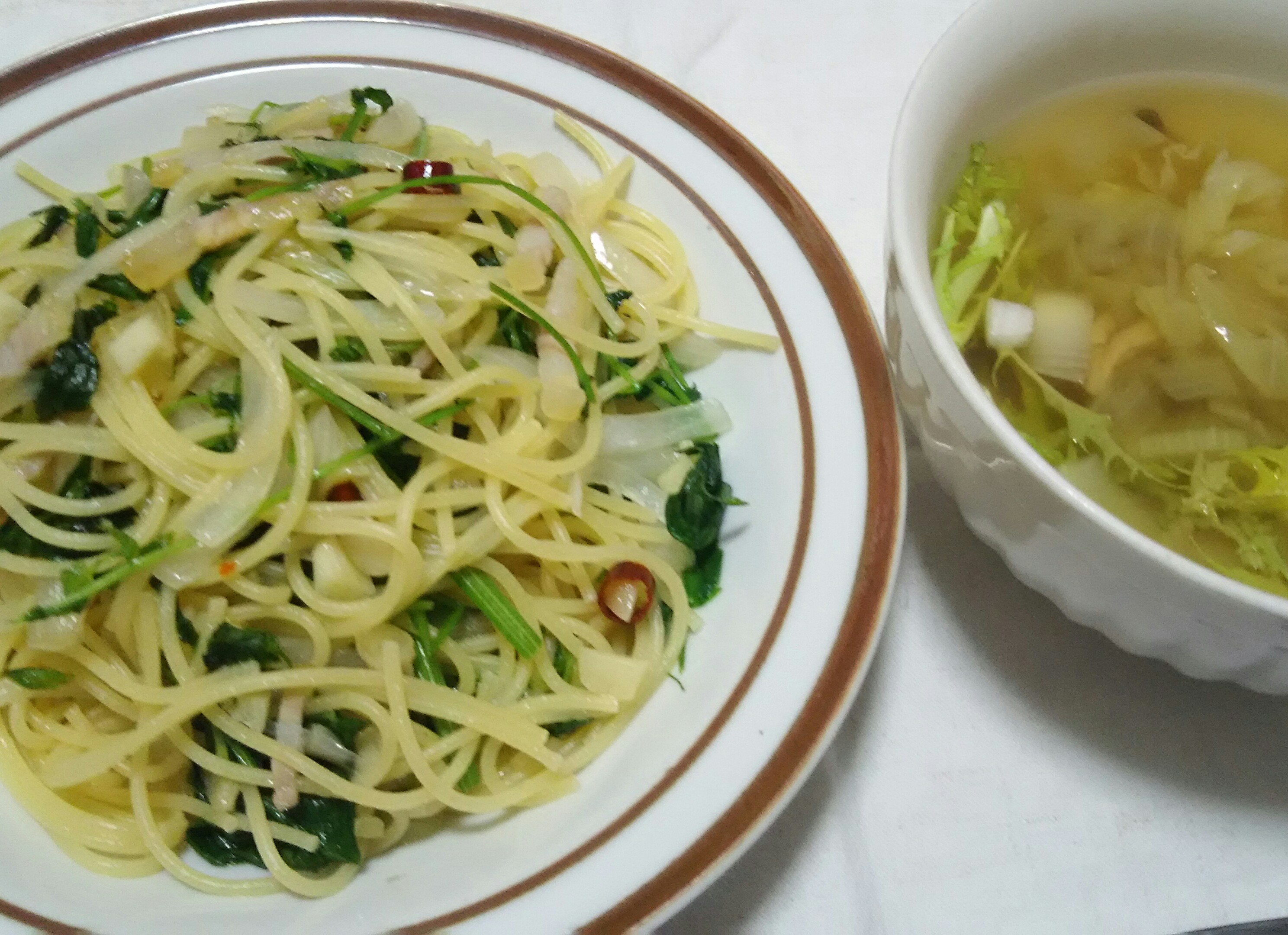 昨日の夕飯(4/13):豆苗入りペペロンチーノ他?